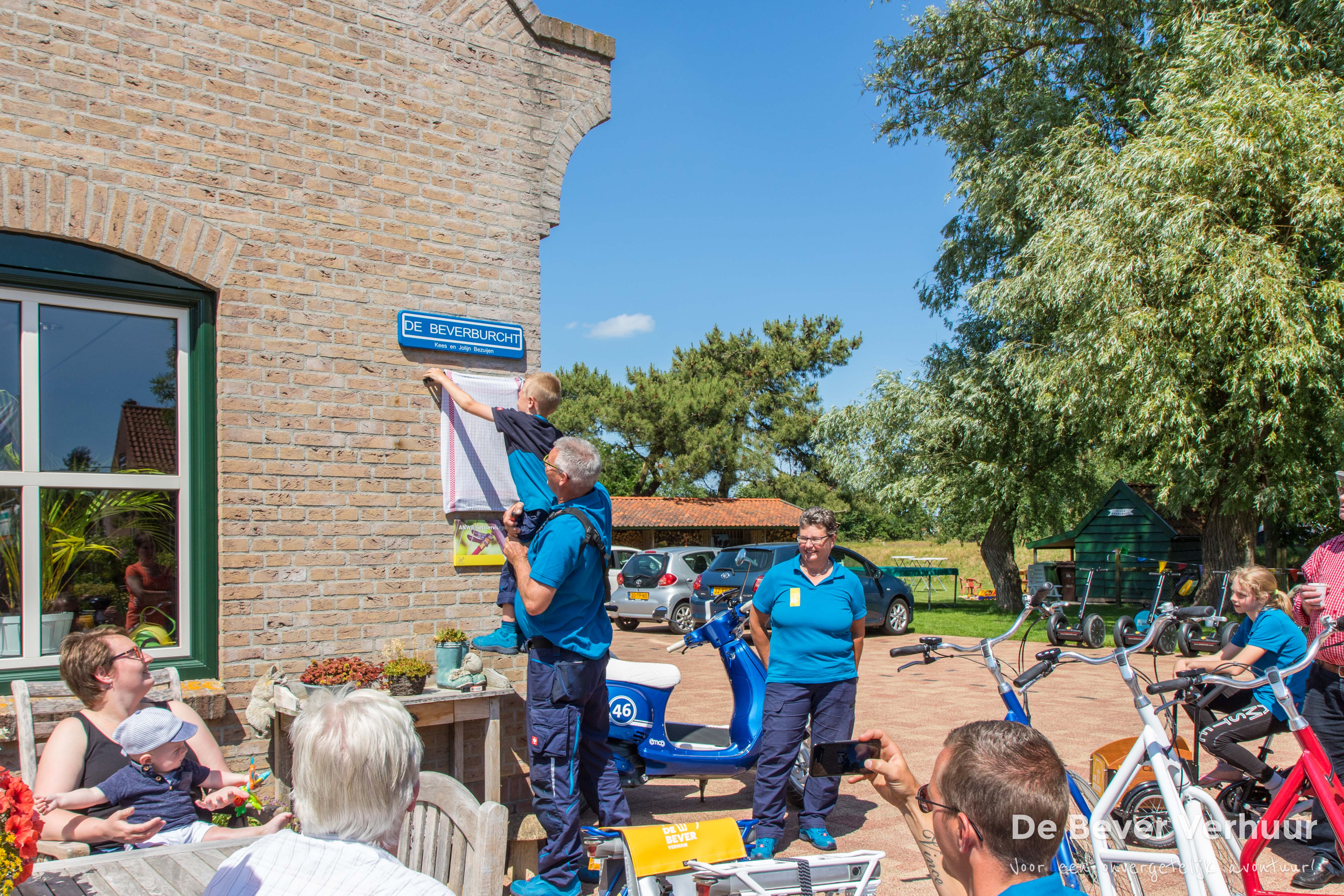 Wanneer je een fijn bedrijf zoekt voor de huur van een vervoermiddel of een eigen ros die het ff niet meer doet: Denk dan maar eens aan De Bever Verhuur! Ze zijn o.a. al het servicepunt voor onder andere EMCO-scooters, Lopifits en Bosch E-bikes. Ook is de Bever Verhuur een ANWB-fietsservicepunt, dat tegenwoordig ANWB Gastvrij heet. Dat was nog niet voldoende. Op de open dag en start van het seizoen was het uitgelezen tijdstip om de volgende stap op de ladder te onthullen. Wat was dan datgene dan dat nog onder doek zat? Pas ’s middags rond 3 uur werd op deze prangende vraag een antwoord gegeven. Kleinzoon Vince, Kees en Jolijn Bezuijen onthulden dat De Bever Verhuur erkend was met een kwaliteitskeurmerk van de BOVAG. Service wordt aan iedereen inclusief alle recreanten gegeven, die onverhoopt met panne langs de kant van de weg komen te staan. Geen paniek dus, denk gewoon even aan De Bever Verhuur!